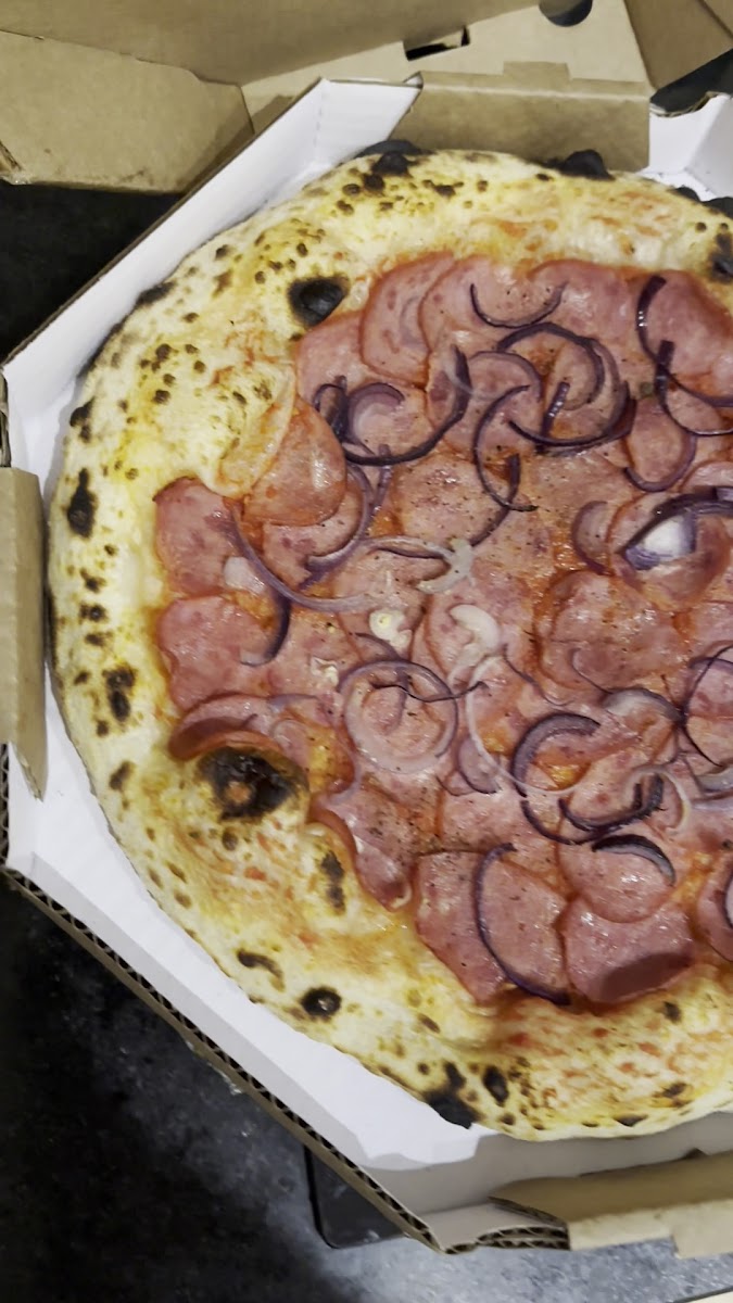Linguiça calabresa defumada, queijo mussarela normal, mussarela de búfala, pecorino italiano e molho de tomate artesanal feito com tomates orgânicos frescos. Opção: Tiras de pimentões amarelos orgânicos.